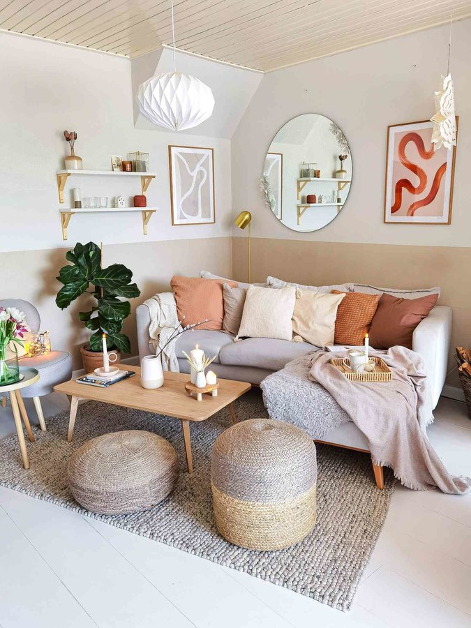 Couch, Sofa, Couchtisch, Sofaecke, Wohnbereich, Wohnzimmer, Wohnzimmerdeko, Kissen, Teppich, Pflanze, Hygge, Scandi, Nordic, Pouf, Braun, Beige