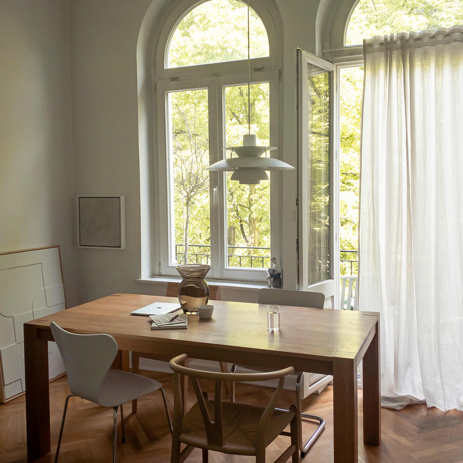 Esszimmer, Esstisch, Altbau, Fischgrätparkett, Kunst, Fenster, Vase, Glas, Glasvase, Stuglmix, Carl hansen, Fritz Hansen, Wishbone Chair