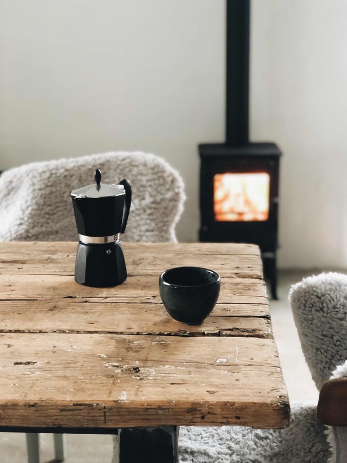 Kaffeepause, Esszimmer, Esstisch, Ofen, Kamin, Fell, Vintage