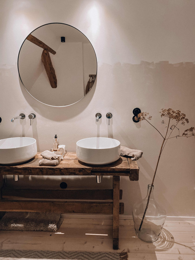 Badezimmer, Bad, Waschbecken, Waschtisch, Werkbank, Trockenblumen, Interieur, Dielenboden, Teppich, Spiegel, Beige