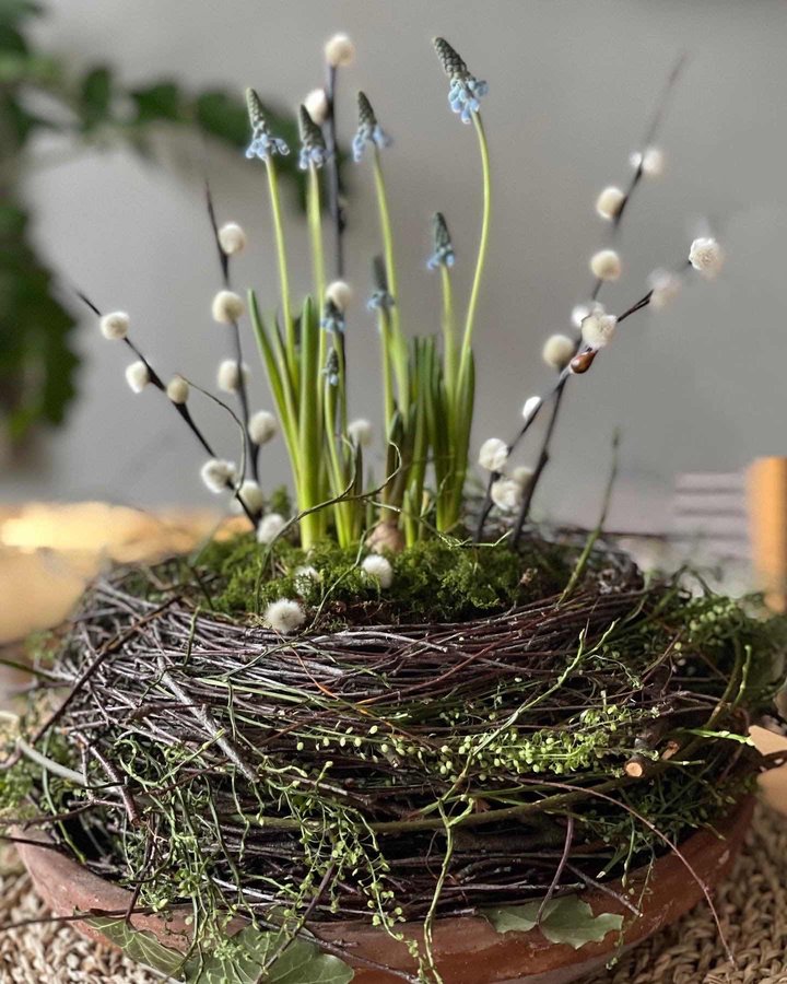 Gesteck, Birkenreisig, Muscari, Weidenkätzchen