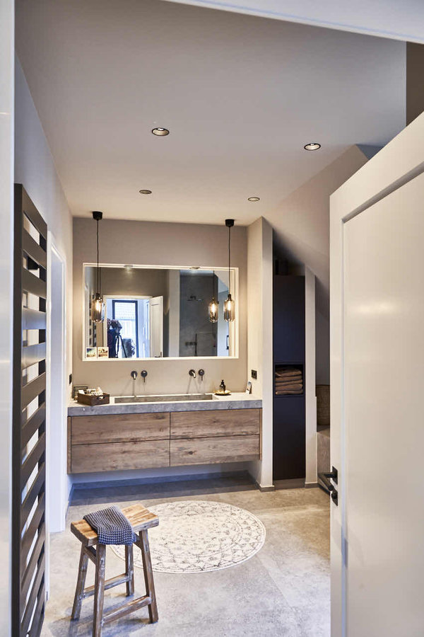 Unser Masterbad, ein Materialmix aus belgischem Blaustein, Eiche narur belassen, Keramikfließen, anthrazitfarbene Armaturen