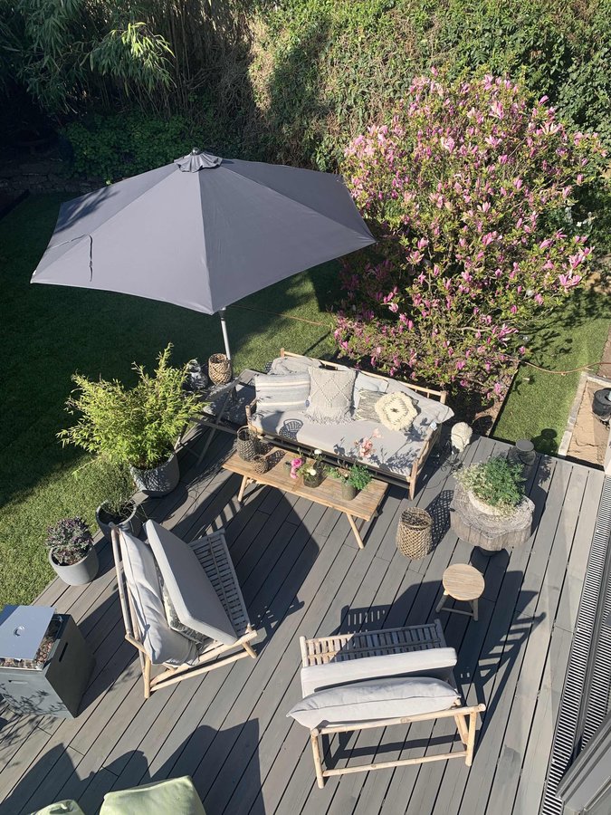 Frühling, Terrasse, Hzterrasse, Garten, Gartendeko, Gartenmöbel, Bambusmöbel, TineK, Sonnenschirm, Terrassenkamin