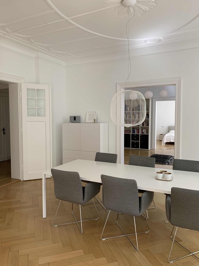 Altbau, Altbauliebe, Ess und Wohnbereich, Esszimmer, Esszimmerstühle, Esstisch, Teppich, Flügeltür, esstischleuchte, Pendelleuchte, Foscarini, COR