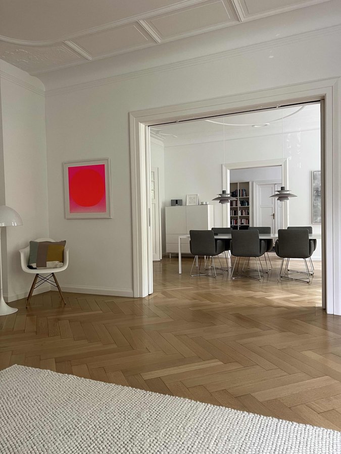 Altbau, Fischgrätparkett, Teppich, Louis Poulsen, Leuchte, Designklassiker, COR, Vitra, Ferm Living Kissen, PIURE, Stuck, Esszimmer, Esszimmerstuhl, Esszimmerstühle, Esstisch