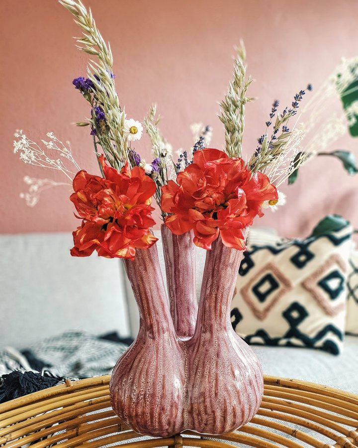 Vase, Blumen, Frischr, Rattan, Kissen, Wohnzimmer, Tisch, Blumendeko, Trockenblumen, Altbau, Altbauliebe, Altbauwohnung, Rosa