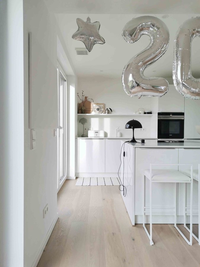 Küche, Weiße Küche, Ballons, Barhocker, Küchenregal, Pappelina Teppich, Louis Poulsen Lampe, Mini Panthella