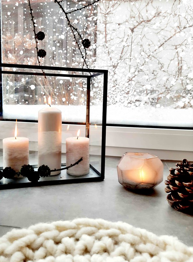 Winter, Schnee, Schneeverwehungen, Kerzen, Teelicht, Guaxs, Zapfen, Sitzkissen, DIY