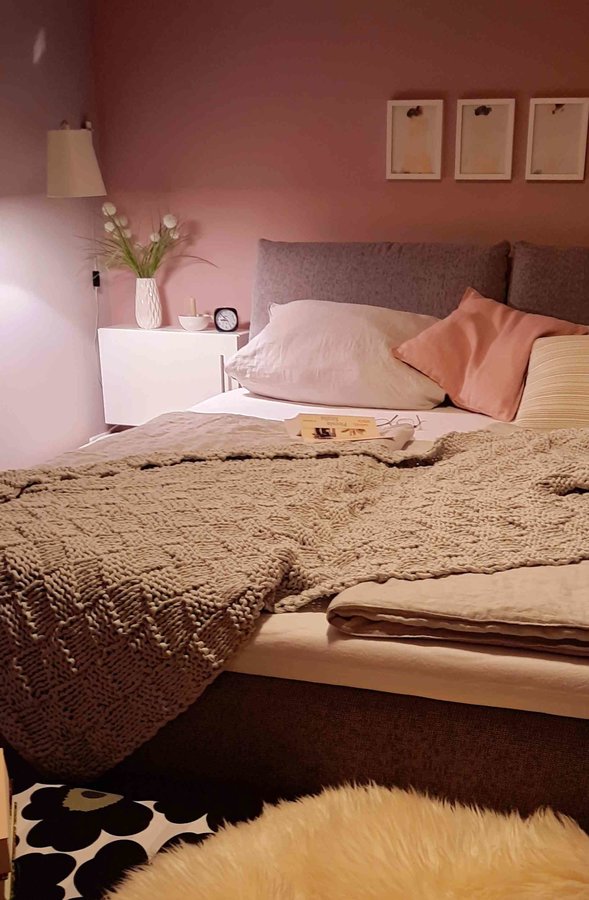 Schlafzimmer, Boxspringbett, Plaid, Leinenbettwäsche
