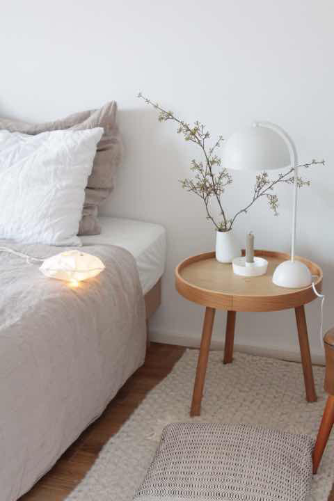 Schlafzimmer, Leinen, Beistelltisch, HübschInterior, Tischlampe, Kissen, Cozylight, Zweig, maisondumonde, Holzbett