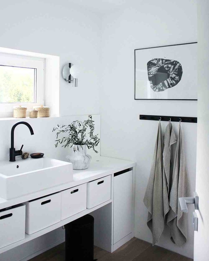 Wir haben damals beim Einzug eine sehr einfache Lösung für die Unterbringung unserer Baduntensilien gefunden. Ich habe ein Brett zugeschnitten, weiß gestrichen und unter den bereits vorhandenen Waschtisch montiert und weiße Holzkisten in den Zwischenraum gestellt. Das funktioniert jetzt seit 7 Jahren einwandfrei.
