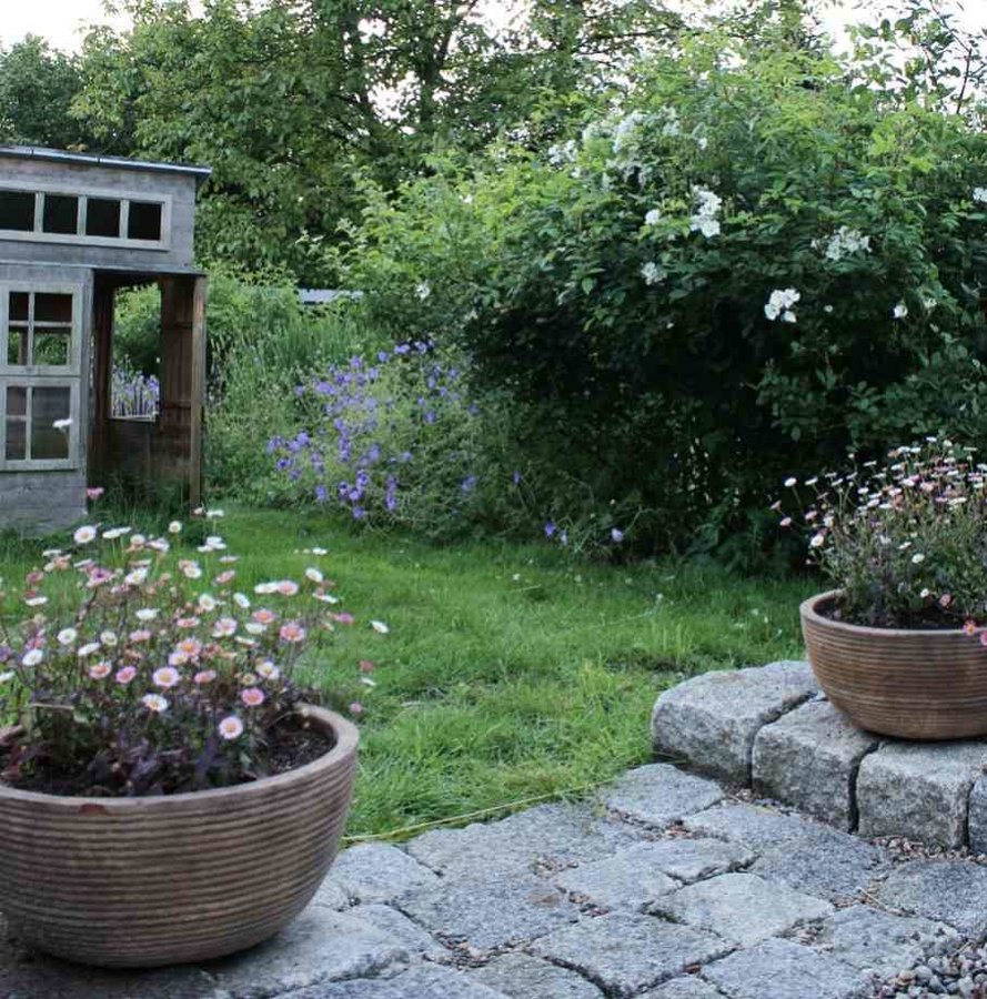 Spanische Gänseblümchen sind super in Töpfen, weil sie echte Dauerblüher sind und nicht sooo viel Wasser brauchen. Die Minimauer aus gebrauchtem Granitpflaster haben wir dieses Jahr gebaut und ist der Übergang vom Kiesgarten in unsere Kräuterrasenfläche.
