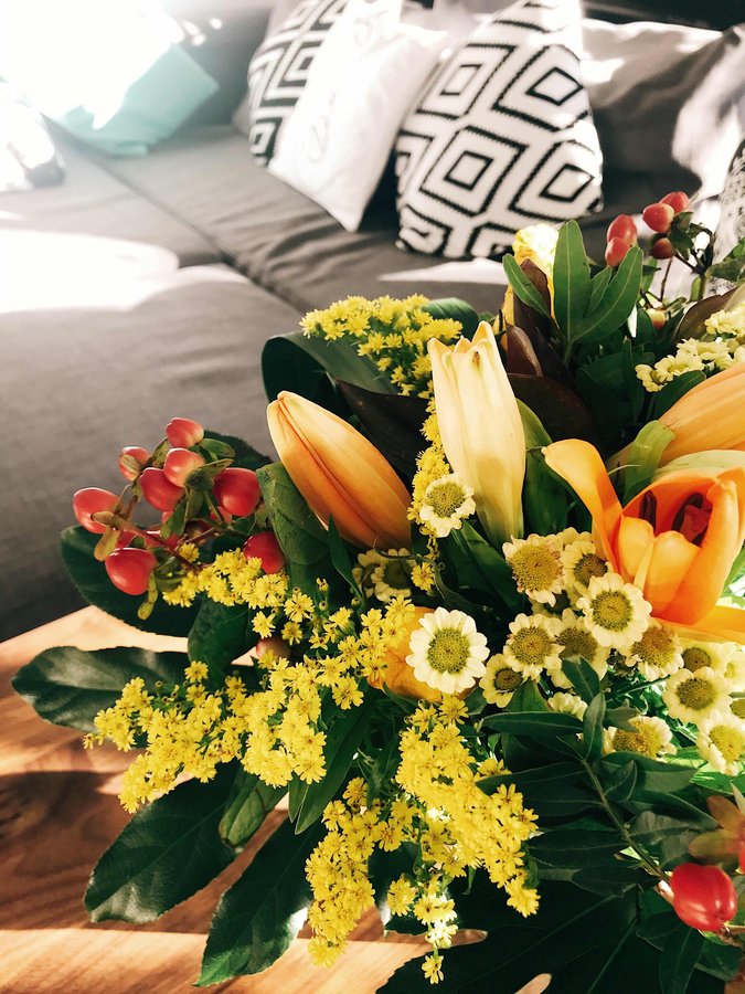 Frische Blumen, Blumenstrauß, Wohnzimer, Sofa, Couchtisch