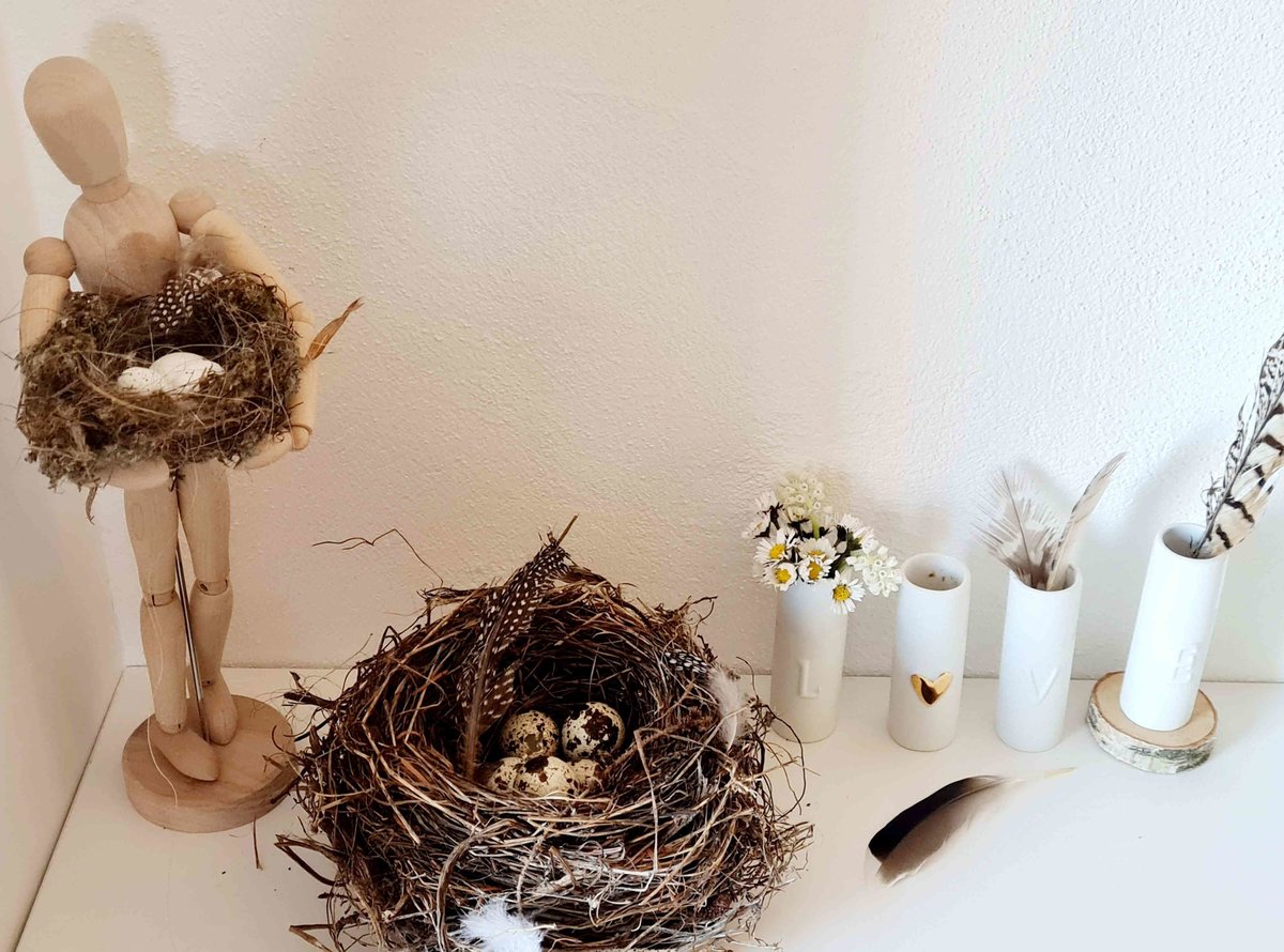 Osterdeko mit echten Vogelnestern (leer gefunden) und gepflückten Gänseblümchen aus dem Garten