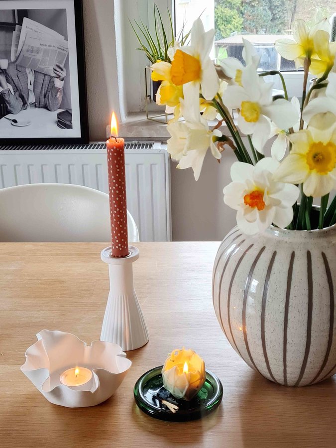Narzissen, Vase, Kerzen, Esstisch, Kerzenhalter