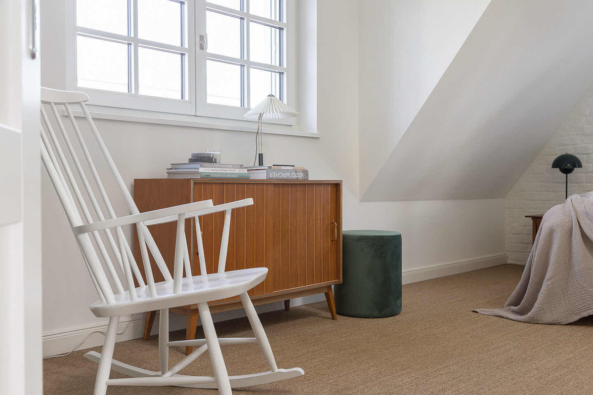 Kommode, Vintage, Schlafzimmer, Schaukelstuhl, Hay Matin Lampe, Vintagekommode, Sisalteppich, Pouf