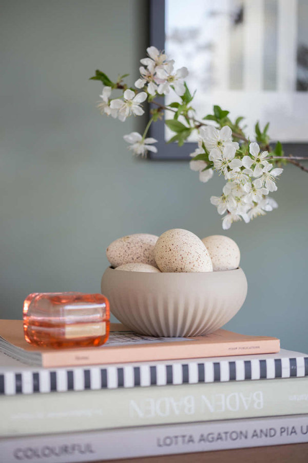Stillleben, Osterdeko, Ostern, Iittala Glasbox, Porzellanschale, dunkelgrüne Wand, Kirschzweige, Blütenzweige