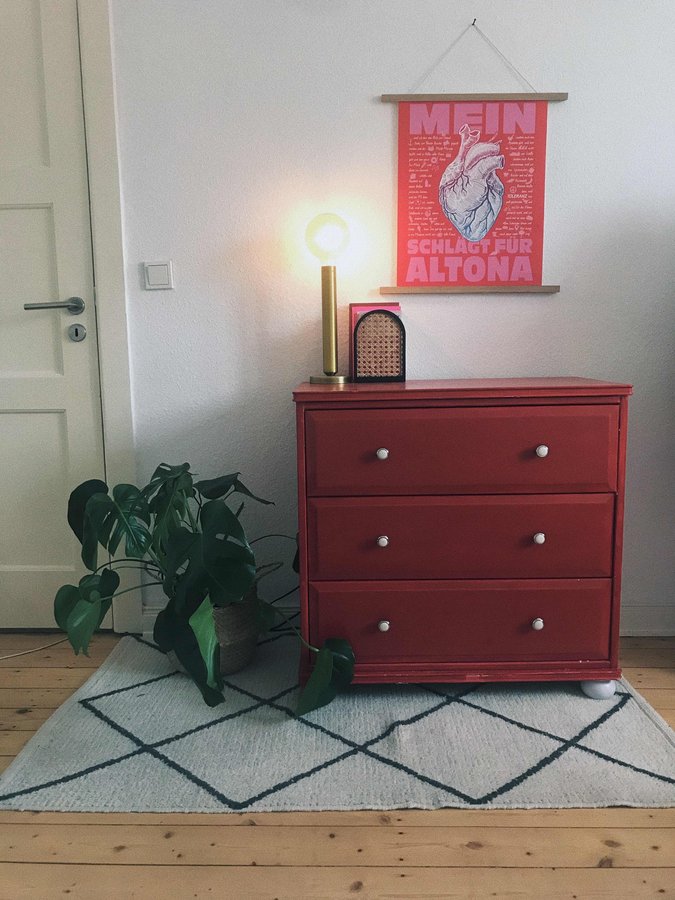 Teppich, Kommode, Rot, DIY, Poster, Pflanze, Monstera, Bücher, Altbau