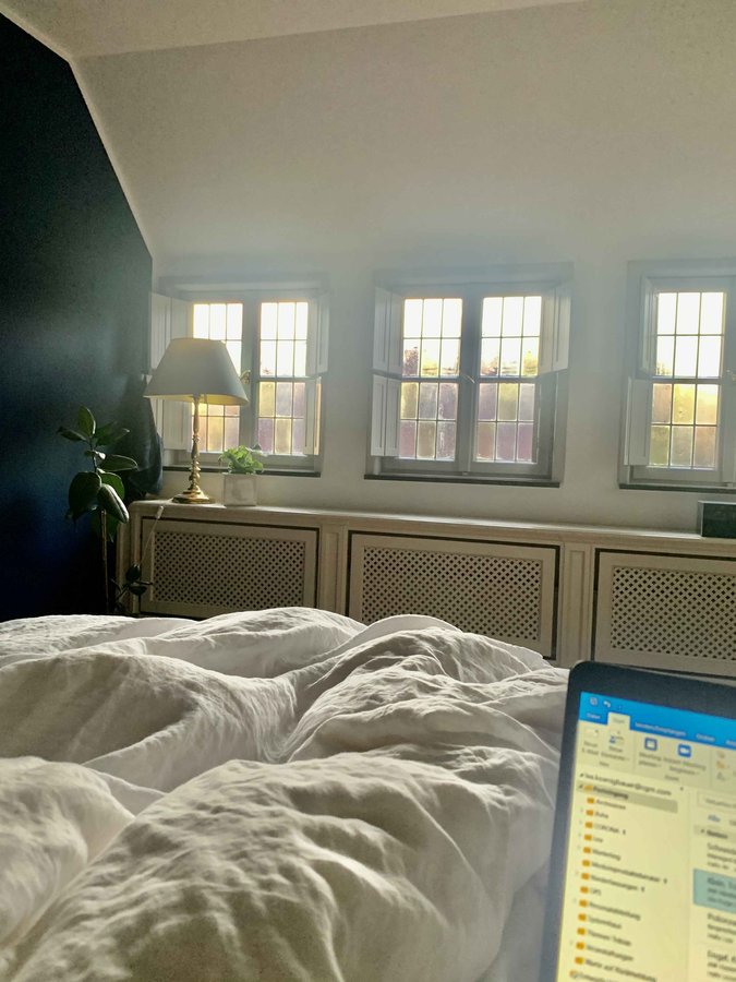 homeoffice, Schlafzimmer, Leinenbettwäsche, Morgensonne, Liebe
