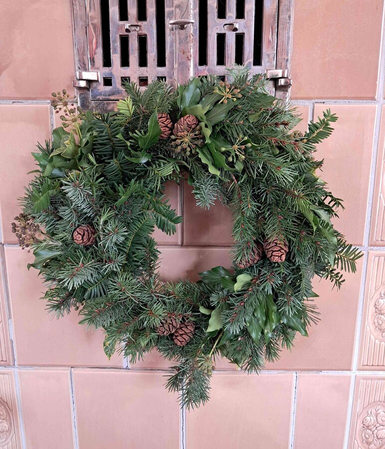 Der 1. Kranz ist vollbracht. Der kommt an die Haustüre. Ein 2. wird verschenkt. Und ein kleiner kommt ans Fenster vom Werkstatthäuschen, das ich von der Küche aus sehen kann. 😊