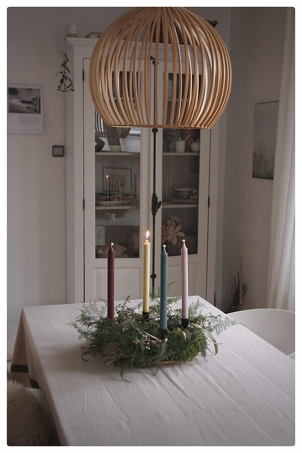 Der Kranz wird morgen nochmal neu auf einem Strohrömer gebunden…die Kerzen sind sehr wackelig. Möchte noch etwas Wacholder mit einbringen.