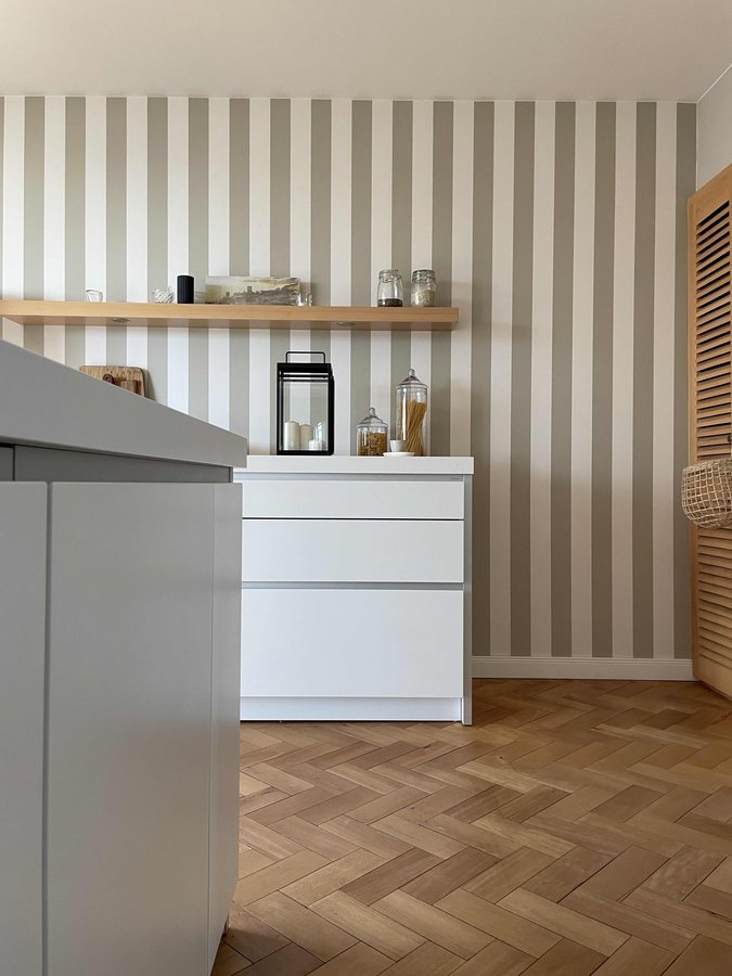 Küche, Bulthaup, Streifentapete, Windlicht, Fischgrätparkett, Parkettboden, Weiße Küche