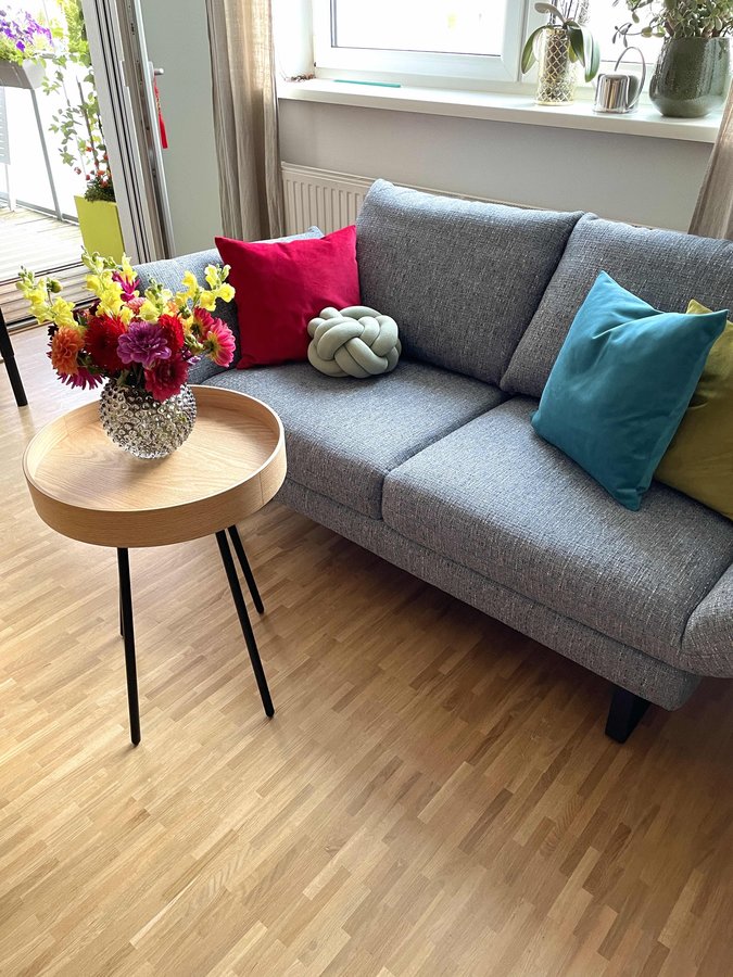 Sofa-Upgrade: von „verschossen erdbeerrot“ zu warmgrau! Und auch erwas kleiner dimensioniert, so passt es besser in mein Mini-Loft… 😅