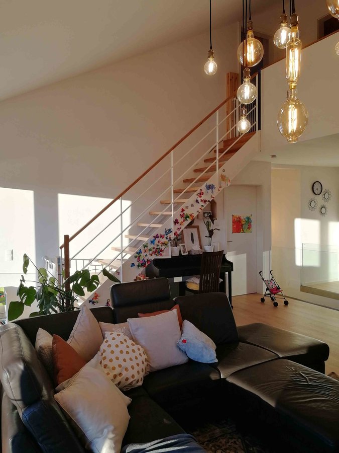 Couch, Kissenschlacht, Ikea, Monstera, Schmetterling, Treppe, Eiche, stahlwangentreppe, Glasgeländer, Klavier, Parador, ModularOne, Wohnzimmer, Luftraum, Lampe