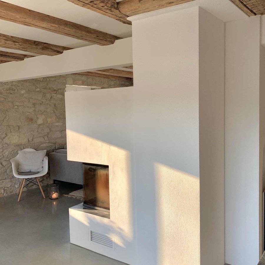Kamin, light, Holzbalkendecke, Altbausanierung, Bruchsteinwand, Naturstein, Sonnenlicht, Morgensonne