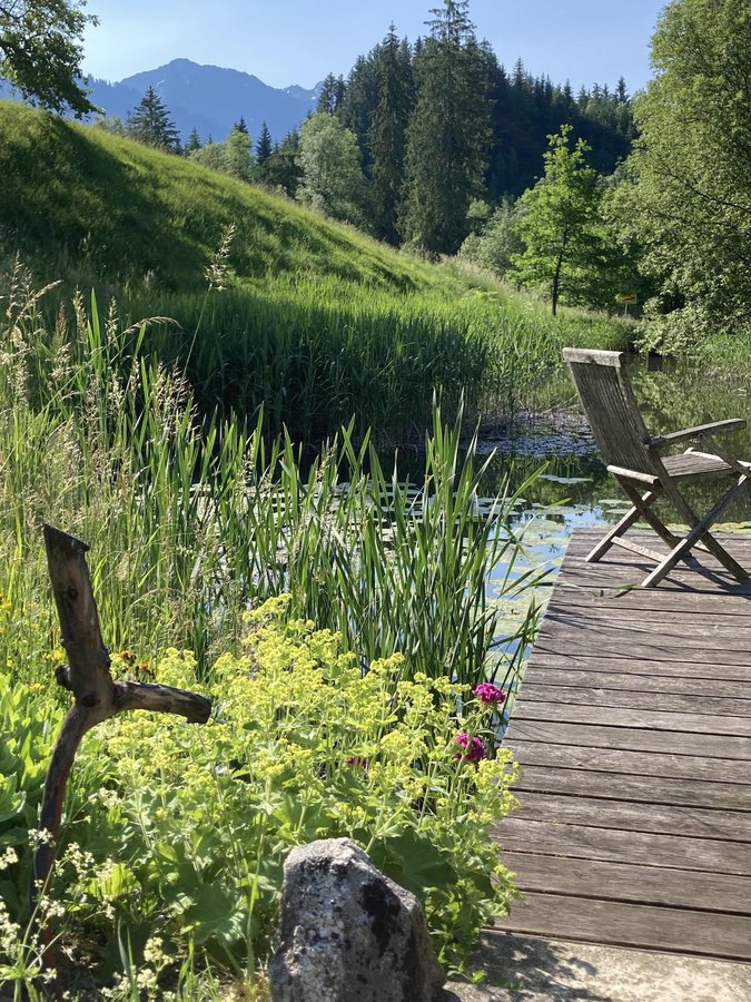 Weiher, Natur, Gartenstuhl, Allgäu, Sommer, Steg