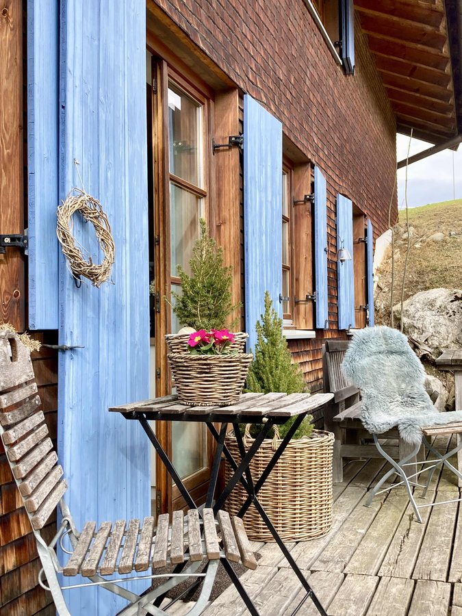 Terrasse, Februar, Sitzplatz, Fensterläden, Körbe, Primel
