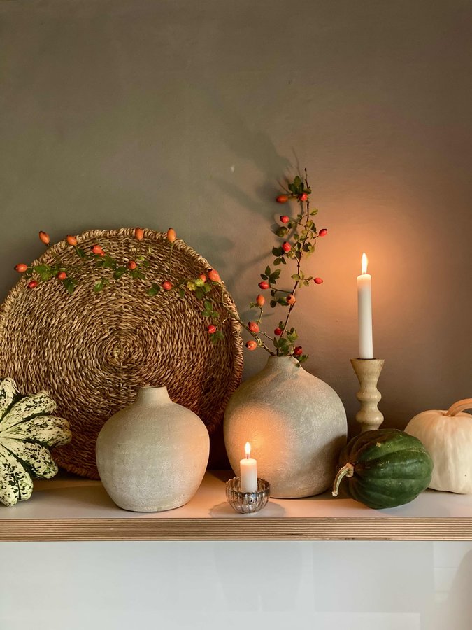 Herbstdeko, Regal, Vasen, Hagebutten, Kürbis