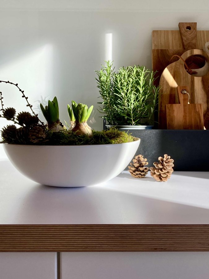 Auch wenn wir uns noch mitten im Winter befinden, habe ich heute bei dem schönen Wetter Lust auf frisches Grün bekommen. Das Advents/Weihnachtsgesteck musste in der Schale weichen und wurde mit drei Hyazinthen, Moos und Lärchenzapfen neu bepflanzt.