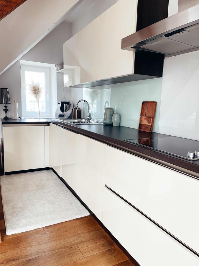 Die Küche - wir lieben es clean und reduziert. Daher sind alle unnötigen Utensilien in den Dchränken verstaut und nur die Küchengeräte sichtbar, die täglich im Gebrauch sind.