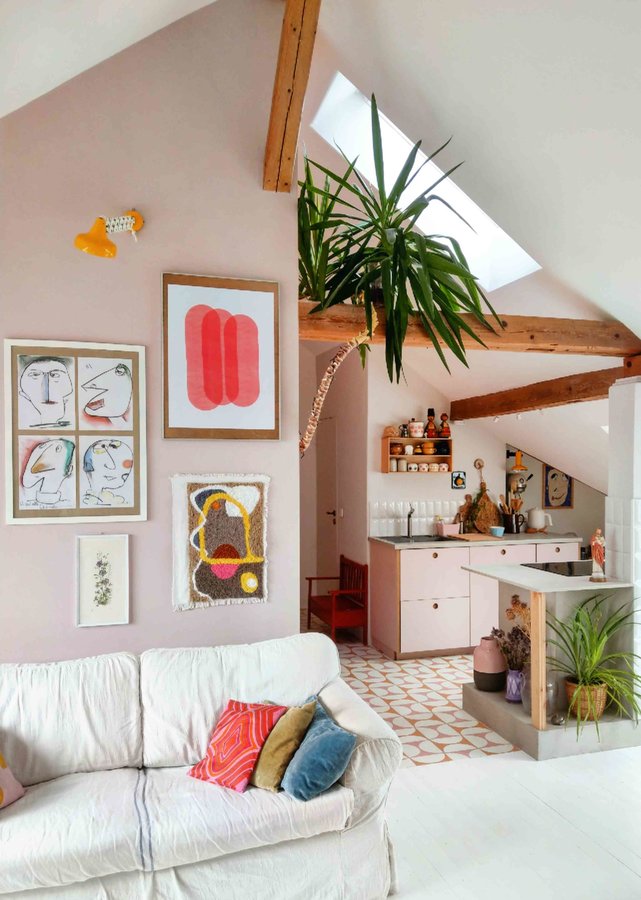 Dachbodenausbau, Küche, Zementfliesen, Poster, Bilderwand, Wohnesszimmer, Pflanzen, Yucca, Theposerstudio