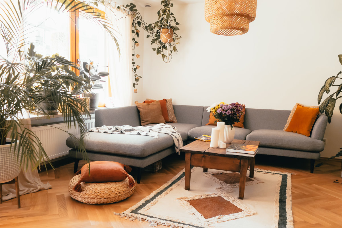 Wohnzimmer, Sofa, Sofaecke, Couch, Couchtisch, Teppich, Boho