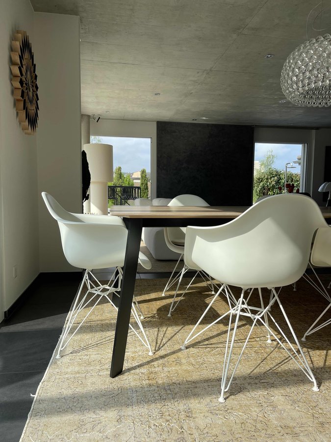 Esszimmer, Esstisch, Teppich, sunflowerclock, Foscarini, Betondecke, Schwarzer Boden, Hausbau 2005, Designklassiker
