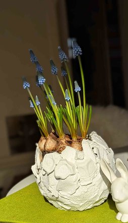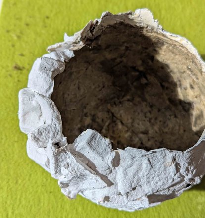 Aus alten Eierkartons und Tapetenkleister habe ich mir diesen schönen Übertopf gemacht.