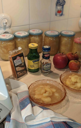Heute Vormittag habe ich die Äpfel aus Nachbarns Garten verarbeitet. Erst Apfelmus eingekocht und anschließend noch einen Apfelkuchen zubereitet.