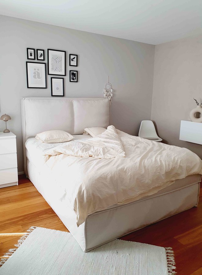 Ausserdem soll die Wand hinterm Bett dann noch die gleiche Farbe erhalten🙈 Die hatten wir bereits beim Einzug in einem anderen Ton gestrichen. Die neue Farbe (rechts) gefällt mir aber besser.