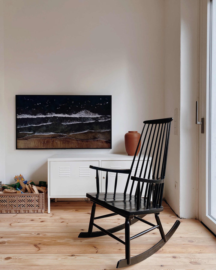 Schaukelstuhl, Vintage, Mid century, Ikea, Wohnzimmer, TV, Dielenboden, Altbau, Umbau, Sanierung, Vase