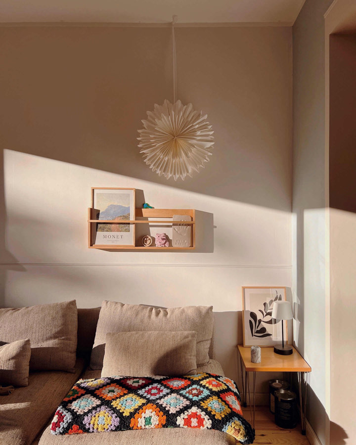 Wohnzimmer, Söderhamn, Sofa, Ikea, Häkeln, Decke, Vintage, Beistelltisch, Regal, Wandregal, Poster, Stern, Weihnachten, Papierstern