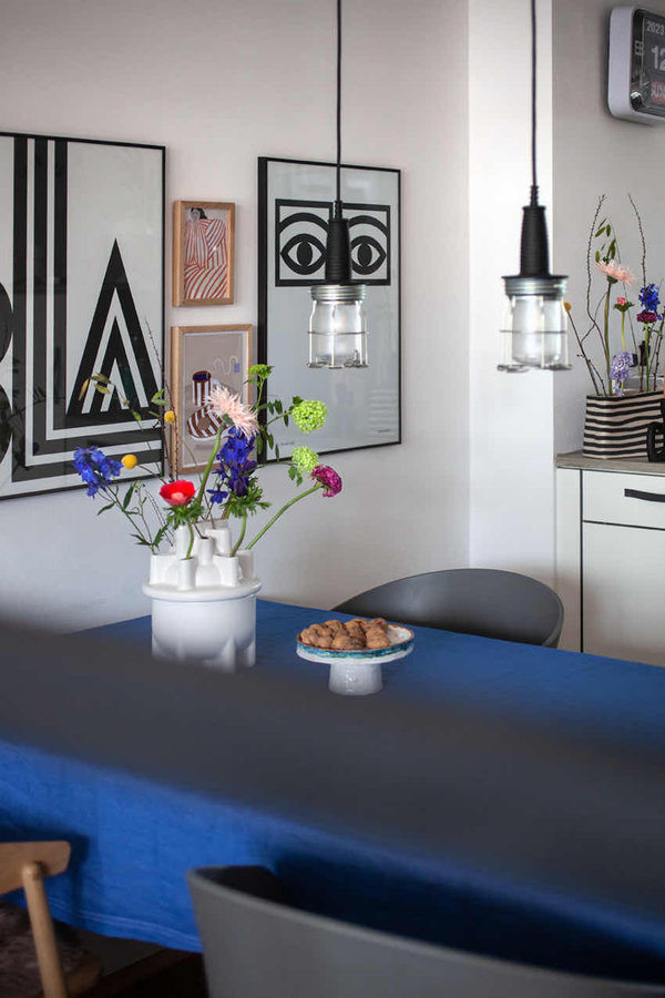 Esstisch, Essecke, Vase, Blumen, Blumenvase, Tischdecke, Blau, Bilderwand