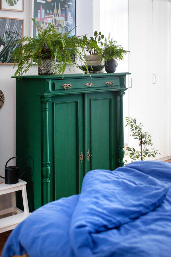 Kommode, Vintage, Schlafzimmer, Grün, Pflanzen, Bettwäsche, Blau
