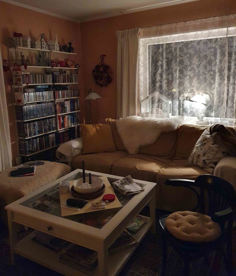 Es geht doch nix über ein gemütliches Zuhause. Das Sofa ist eigentlich reinweiß, was leider nicht so pflegeleicht ist, wenn man einen Schwedenofen beheizt.