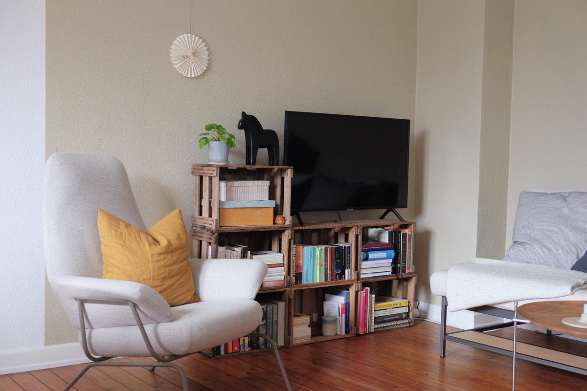 Wohnzimmer, Sessel, Weinkiste, Regal, Dielen, Dielenboden, Schöner wohnen