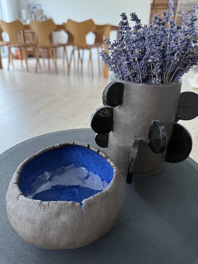 Neue Keramikschale: Bin ganz begeistert von der leuchtenden blauen Glasur im Kontrast zum rauen, schwarzen Ton.