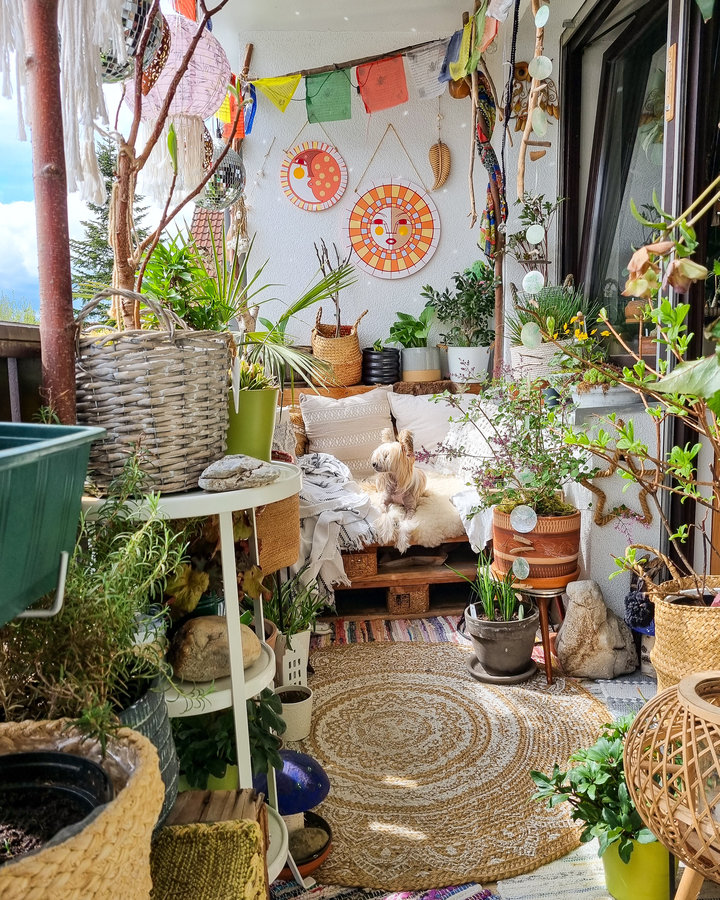 Balkon, Terrasse, Pflanzen, Urban Jungle, Beistelltisch, Deko, Dekoidee, Teppich, Kissen, Paletten, Lounge, Patio, Korb, Flieder, laterne, Kerzen, Naturdeko, Dekorieren, Outdoor, Hygge