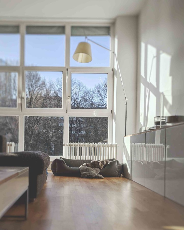 Durch diese wahnsinnige Fensterfront strahlt das Wohnzimmer so sehr!
