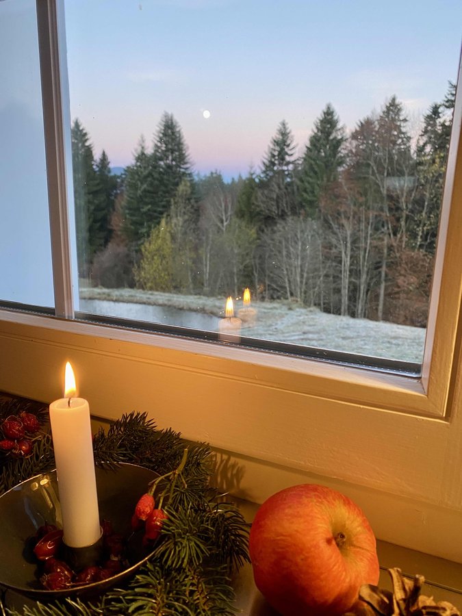 Mein heutiger Blick aus dem Küchenfenster. Nach einer frostigen Nacht ist die Oberfläche vom Biotop gefroren und der Mond verabschiedet sich langsam.